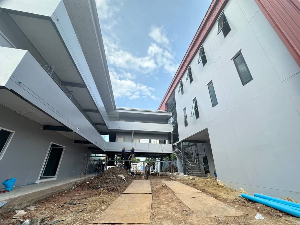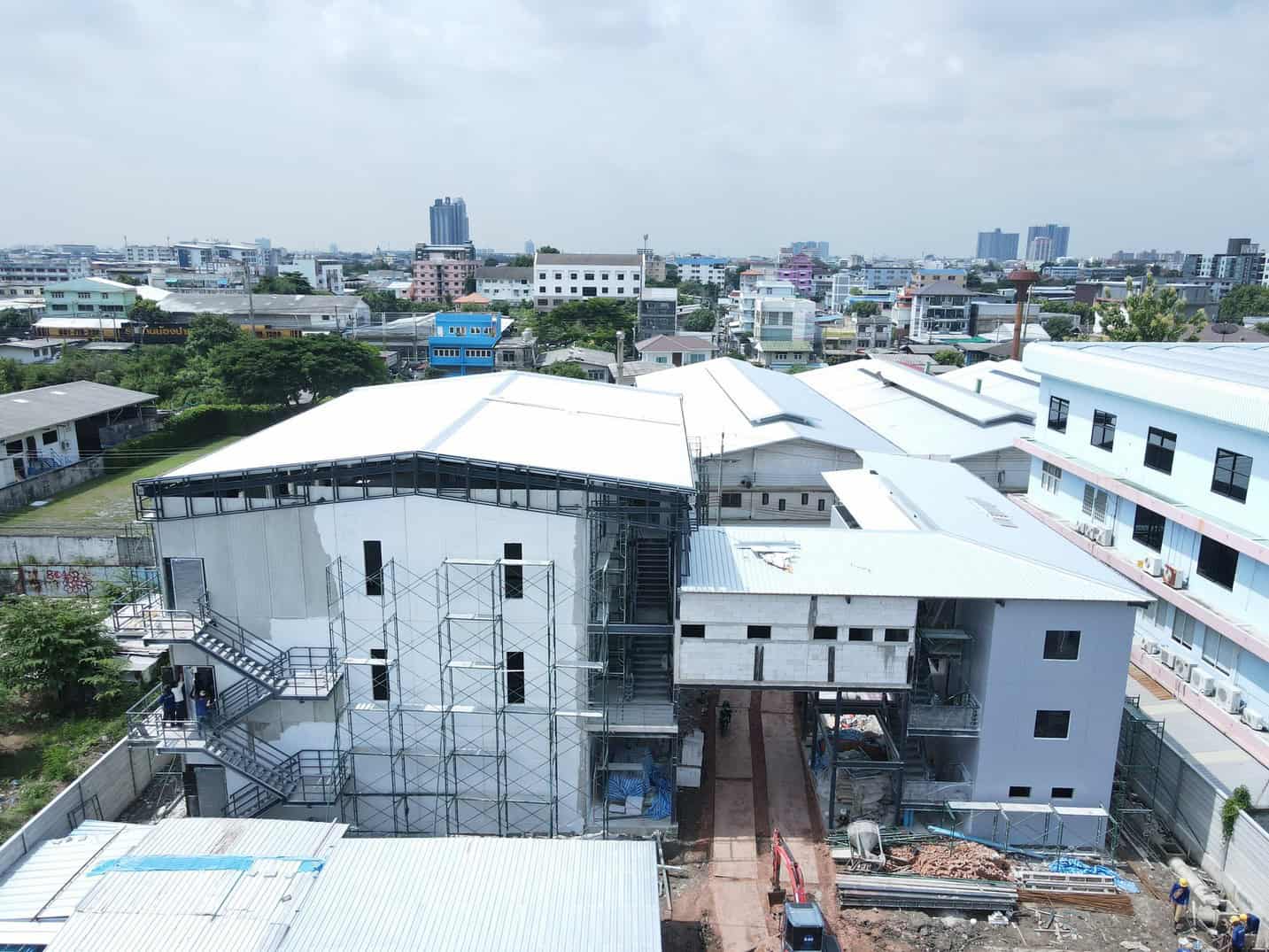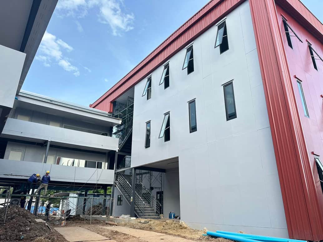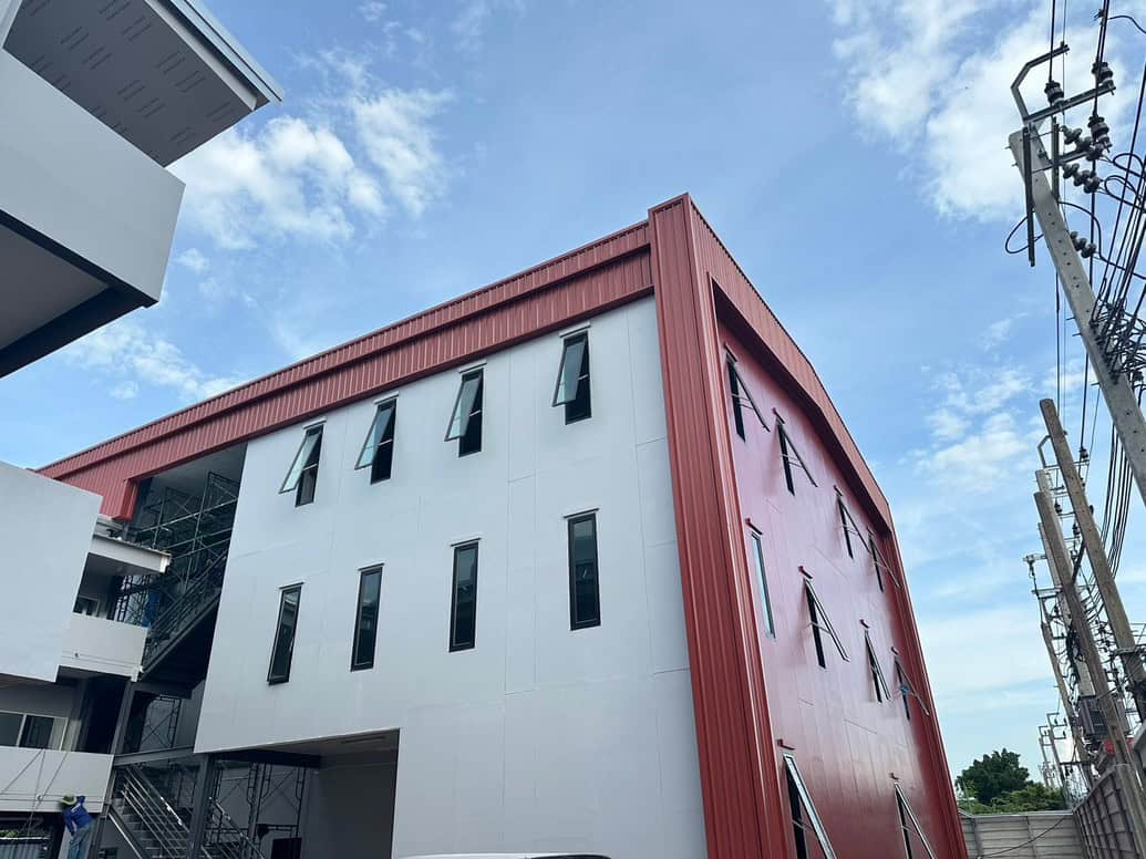 CDI New factory and office ก่อสร้างอาคารผลิต และหอพักพนักงาน โรงงานเย็บผ้าม่านคุณภาพสูง เนื่องจากข้อจำกัดของพื้นที่ก่อสร้างที่อยู่ในซอยแคบ การเลือกใช้วัสดุสำเร็จรูป ที่เตรียมผลิตจากหน้างานจึงเป็นทางเลือกที่เหมาะสม งานโครงสร้างเลือกใช้โครงสร้างเหล็กสำเร็จรูป พื้นผนังเลือกใช้แผ่นผนังสำเร็จ พรีคาสคอนกรีตจาก V-Con ทำให้ติดตั้งงานโครงสร้างได้อย่างรวดเร็ว และ ไม่รบกวนบริเวณข้างเคียง บริษัทฯ ให้บริการออกแบบและยื่นขออนุญาตก่อสร้าง พร้อมก่อสร้างแล้วเสร็จทุกระบบแบบ Turnkey ครบ จบ ที่เดียว Client: Charoen décor international Co.,Ltd. Date: 2023