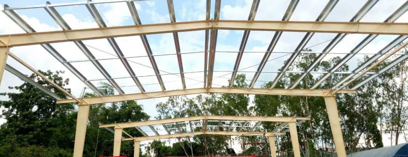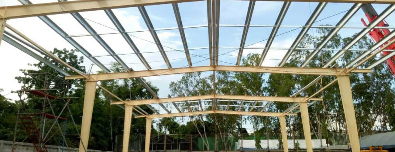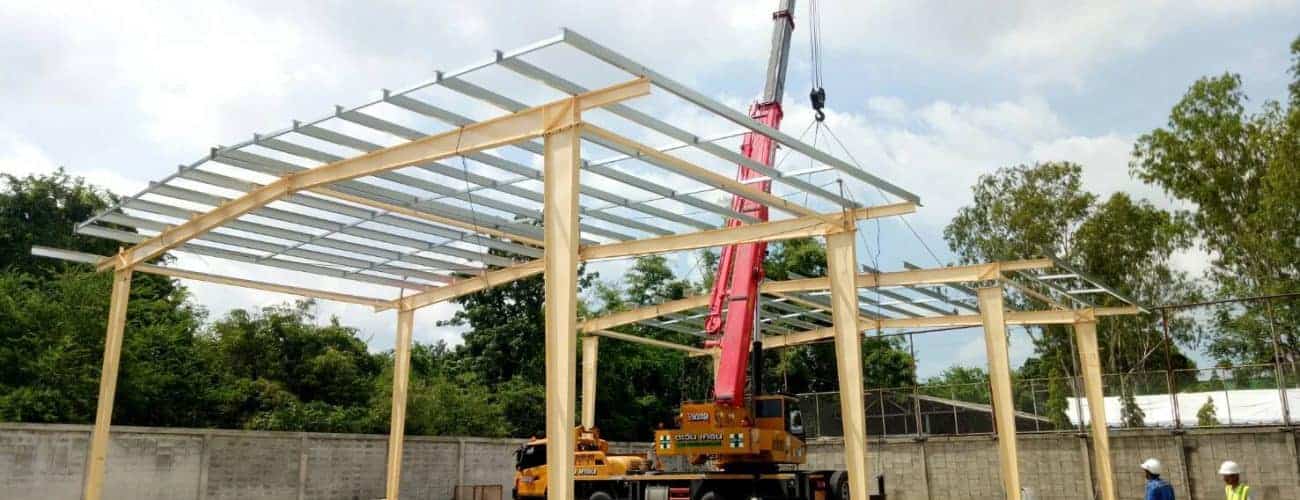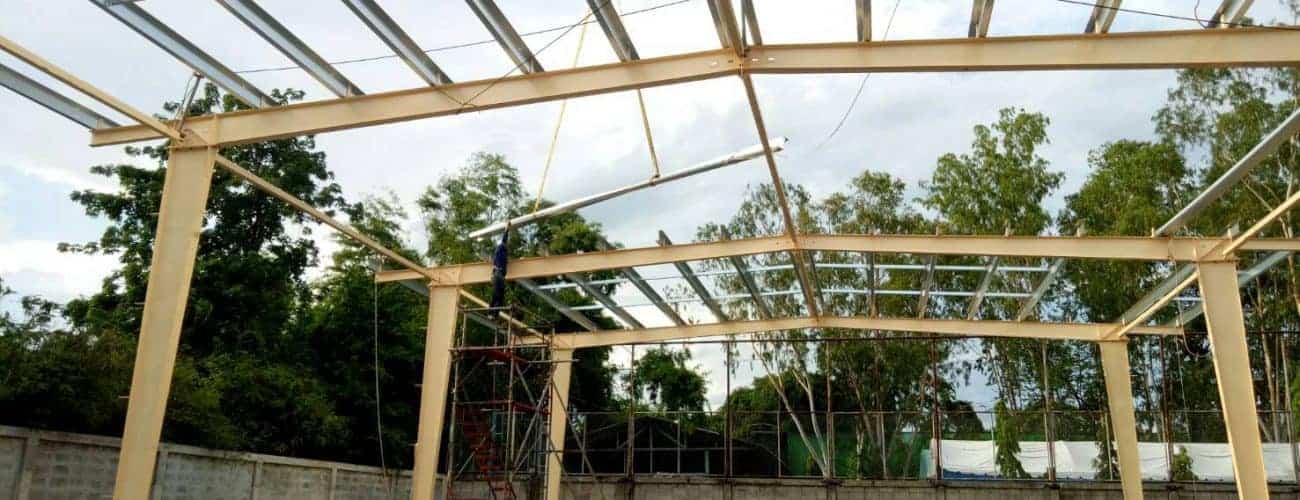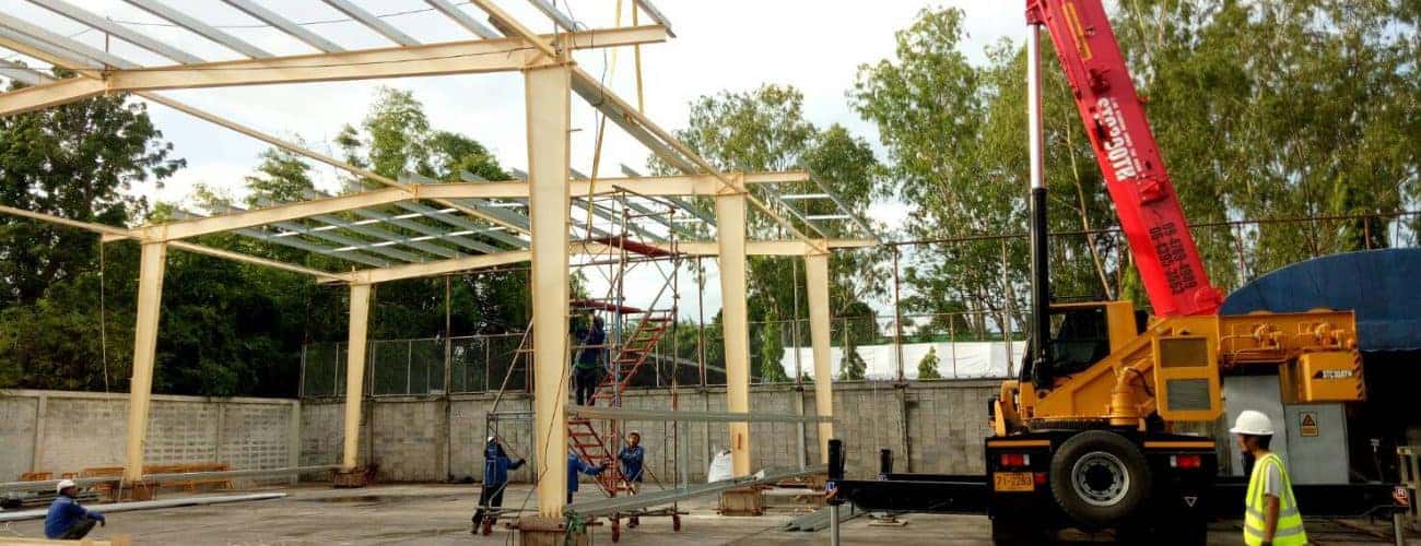 งานเพิ่มโครงสร้างเหล็กระบบ PEB พร้อมมุงหลังคาเมทัลชีทบนพื้นคอนกรีตเดิม