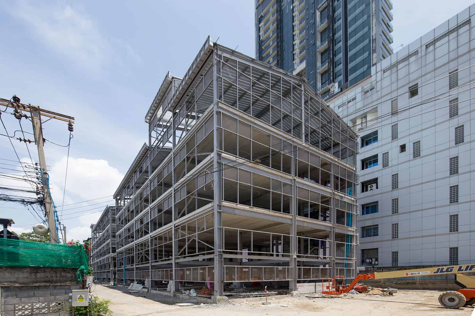 เจ้าของโครงการต้องการอาคารที่มีรูปแบบทันสมัยมีสถาปัตยกรรมที่สวยงามจึงได้นำเสนอโดยมีสถาปนิกออกแบบตาม Concept ที่ได้รับมา เนื่องจากลักษณะที่ดิน เป็นที่ดินที่หน้าแคบแต่ยาวและไปกว้างที่ช่วงปลายทำให้หน้ากว้างของอาคารแต่ละ Span ไม่เท่ากันโครงสร้างเหล็กระบบ PEB สามารถตอบโจทย์การทำงานที่มีลักษณะ นี้ได้อย่างเหมาะสม ยืดหยุ่น รวดเร็ว ลักษณะการใช้พื้นที่นี้ซึ่งเป็นที่เช่าระยะยาว หากไม่ต่อสัญญาสามารถรื้อถอนอาคารไปสร้างที่ใหม่ได้ หรือถ้าไม่ต้องการ มูลค่าซากที่เหลือก็ประมาณ 30% ของมูลค่าเหล็กของโครงการที่ลงทุนไป